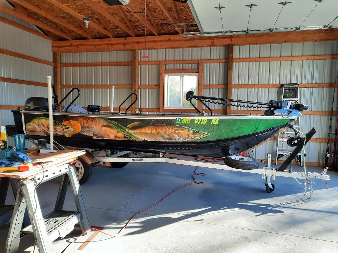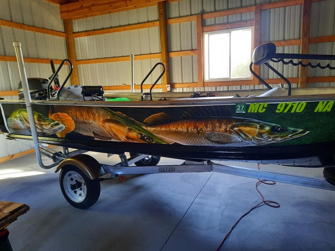 Seems I just can't leave well enough alone. Bought the custom Wrap and supplies and installed it myself for around $300.00 It wasn't easy but better than the $1,500,00 some places wanted to do the job. If you're interested in just where I bought this wrap that cheap, message me. Here's the before and after pictures. Doing the other side tomorrow. Click on photos for best look. She looks nothing like the 1986 Trailer and Sea Nymph Fishing Machine boat I bought last winter does it. thumbs_up
